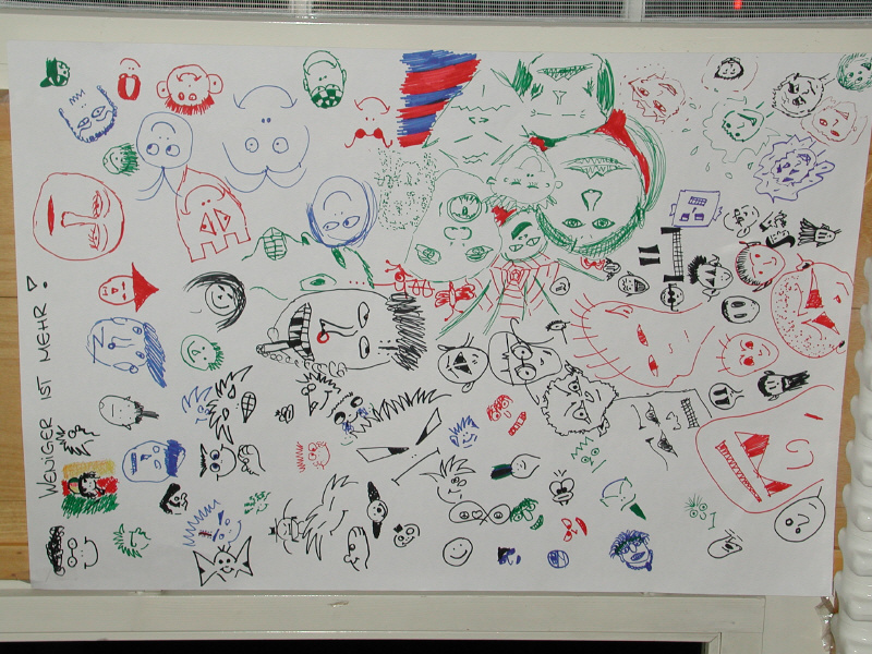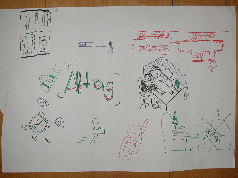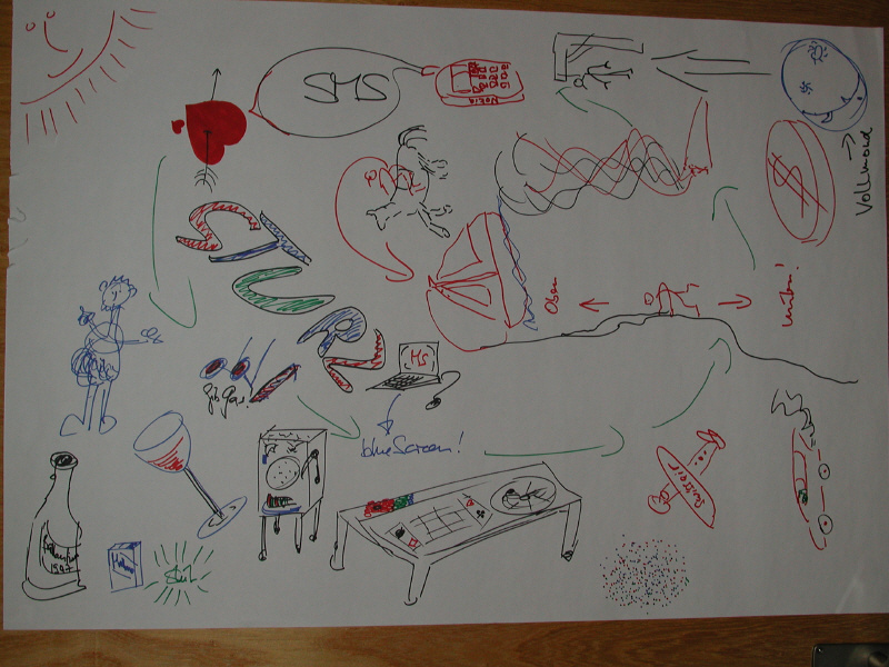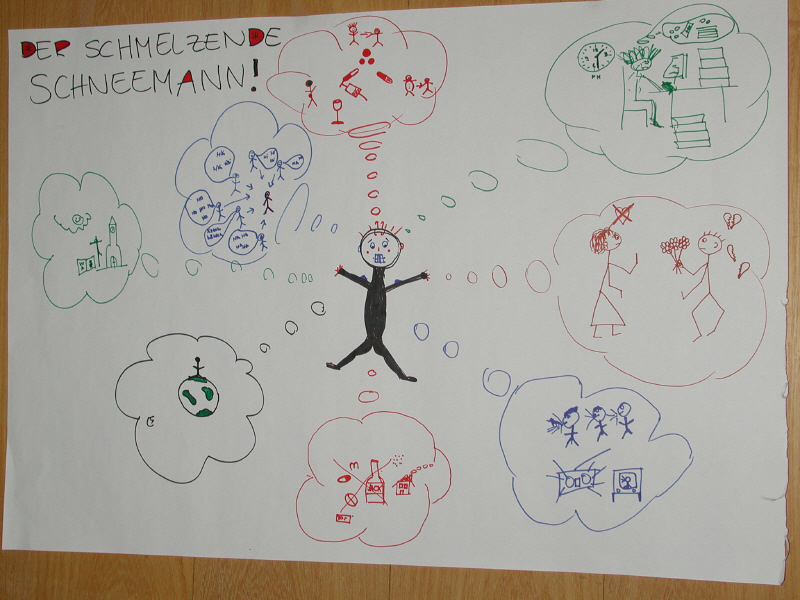 Am anderen Morgen suchten die Gruppen nach Absturz-Gefahren: Vereinsamung und Isolation, der ob all der (schlechten) Einflüsse schmelzende (schwarze) Schneemann, das Mobbing (alle zeigen auf Einen), der ewige Trott des Alltages, fatale Kreisläufe, Weniger Ist Mehr!