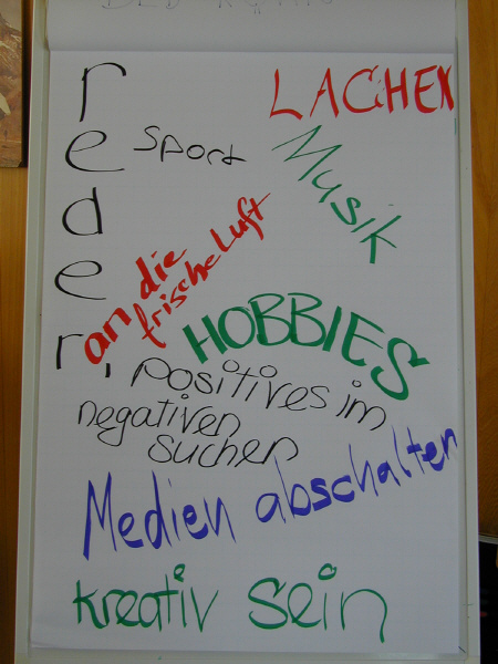 In einer ersten Gruppenarbeit wurde nach unseren Aufstellern gesucht: Gefunden wurden unter anderen: Hobbies, Lachen, Reden, Kreativität, frische Luft...