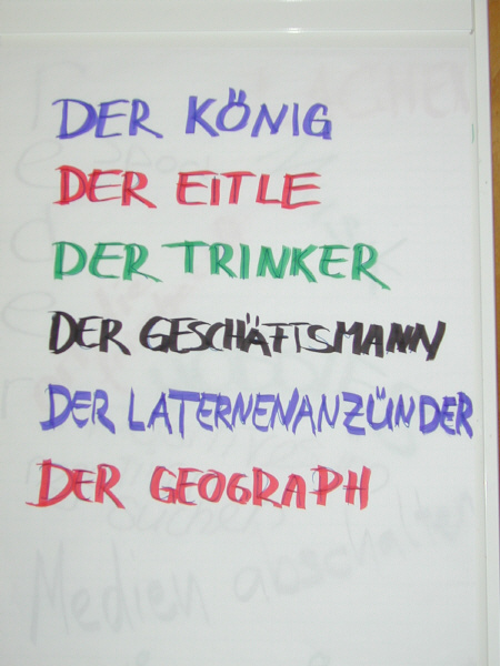 Die sechs verschiedenen Charaktere (König, Eitle, Trinker, Geschäftsmann, Laternenanzünder und Geograph) bilden Eigenheiten eines jeden ab.