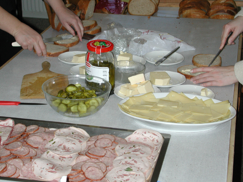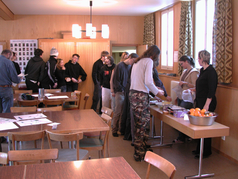 Heute Morgen, zeichnete sich ab, dass heute nur wenige auf die Piste gehen werden. Dass Wetter war nämlich nicht so toll wie wir das gern gehabt hätten. Es schneite und war Neblig. Noch etwas Neblig war auch der Blick vieler, als wir uns um 8:15 wieder im Aufenthaltsraum versammelten. Das Thema war Taschentheater. Mit 3 oder 4 Gegenständen musste ein kleiner "Kurzfilm" produziert werden. Obwohl die meisten wohl noch im Halbschlaf waren, liefen einige zu kreativen Höhepunkten auf! =) Doku, Action, Drama, Komödie, Special Effekt-Film, die Spanne des Film-Gernre war gross. Natürlich wurden die Clips durch eine drei Köpfige Jury bewertet. Gewonnen hat prompt die Titanikschnulze mit 3 Oscars. Der 1. Preis war zwar nicht so glamurös wie eine Oscarstatue, aber ein Snicker schmeckt dafür besser! Ausser ein, zwei Ausnahmen beschlossen alle sich "abseits" der Piste zu vergnügen. Eine Gruppe machte sich auf und relaxte in einer Sauna, andere gingen Billiard spielen. Andere "chillten" lieber einfach nur. Am Abend gab es dann Bernerplatte mit Sauerkraut und Zungenwurst. Im Aufenthaltsraum wurde dann über Politik geredet und diskutiert. Um 9.30 durften wir dann endlich unsere Zeit wieder selbst gestalten: Ausgang!!!