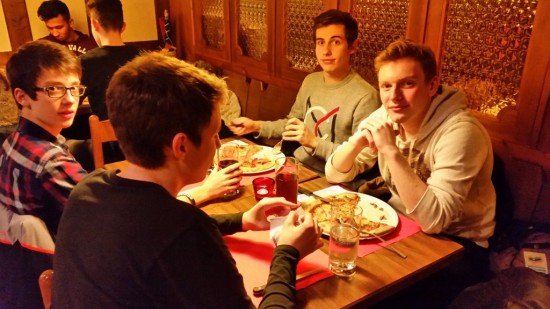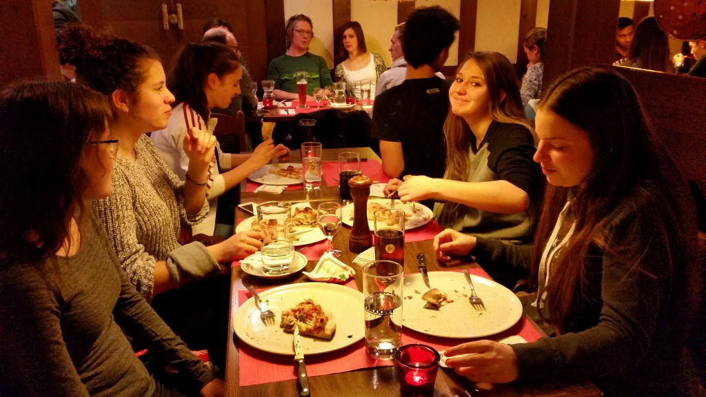 Um 17.30 Uhr machten wir uns auf den Weg, um im Restaurant Kreuz Pizzas zu essen. Bis alle von dieser grossen Truppe ihre Pizzas hatten, dauerte es wenig, schmeckten aber dennoch sehr gut. Wir konnten bei der Zubereitung zuschauen, was eindrücklich war. Zum Dessert gab es ein leckeres Karamell Köpfli mit Schlagrahm, welches allen vorzüglich schmeckte.