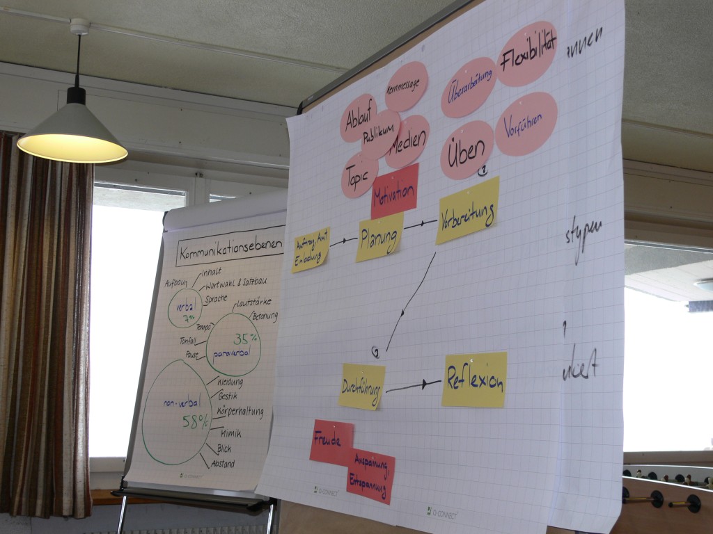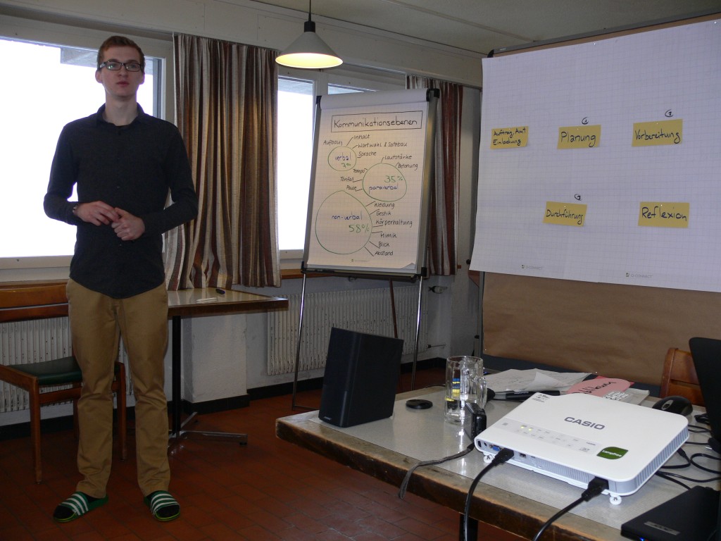 Wie jeden Morgen trafen wir uns mehr oder weniger pünktlich um 7.30 Uhr morgens am Frühstückstisch. Die Skifahr-Motivation hielt sich in Grenzen, weil das ganze Tal vernebelt war. Nach einem ausgiebigen Zmorge und einer kurzen Pause wurden uns von Sven wichtige Dinge im Bereich Auftrittskompetenz und präsentieren vermittelt. Die Lektionen gestalteten sich sehr kurzweilig, weil Sven auf verschiedene Ebenen eingegangen ist und uns auch selbst arbeiten liess. In drei Gruppen wurden die Themen Planung, Vorbereitung und Durchführung bearbeitet und im Plenum diskutiert.