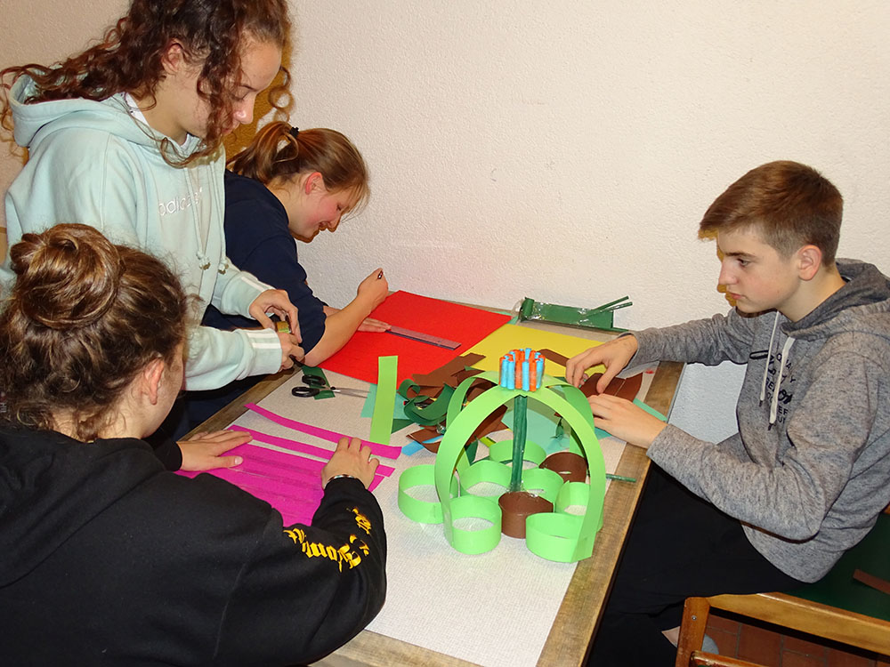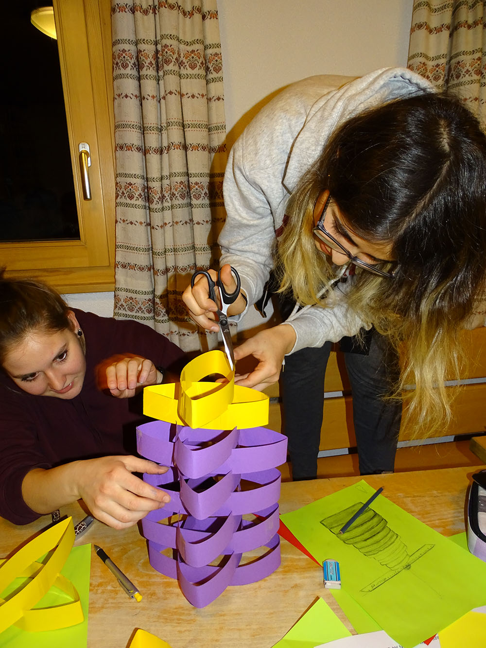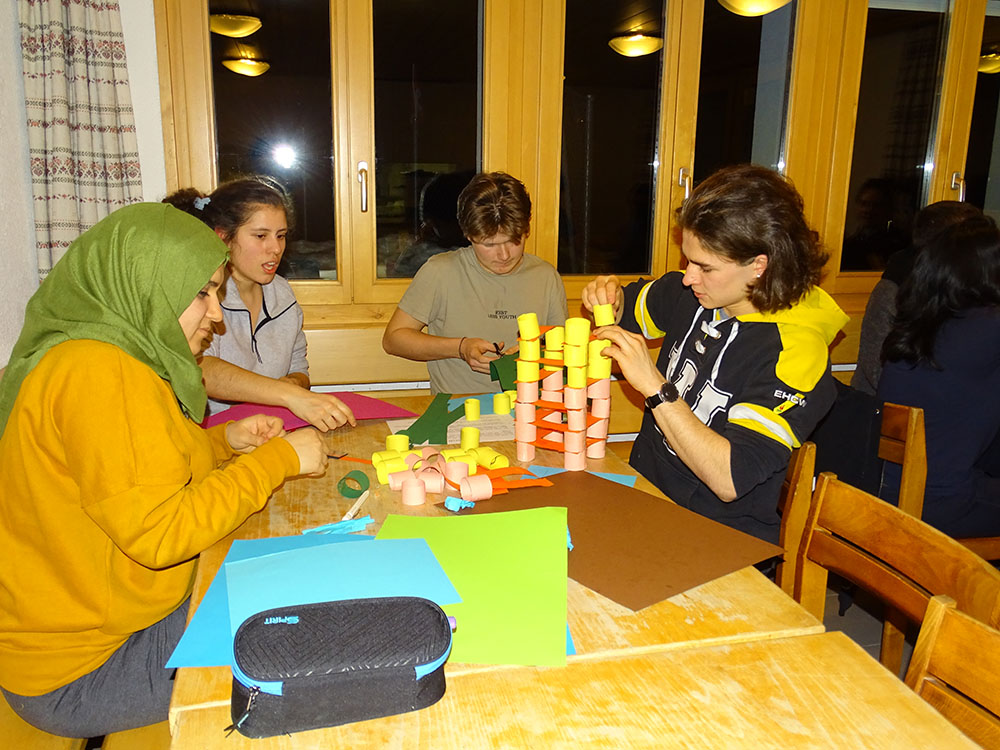 Mit gefülltem Magen erledigte jeder seine individuellen Ämtli und wir kamen dann für den ersten Theorieblock um 20.15 Uhr zusammen. Um die Teamfähigkeit in dieser neuen Konstellation von Lehrjahren zu testen, wurde von Denise zuerst ein Quiz über die höchsten Gebäude der Welt durchgeführt. Anschliessend stellt Denise die Aufgabe in kleinen Teams einen möglichst grossen Turm aus Papier/Karton zu entwerfen, der schlussendlich einen Massstab zu tragen vermag. Zu unserem Erstaunen wurde der mächtigste Turm sensationelle 1,80 m hoch und somit grösser als die meisten Teilnehmer/innen.